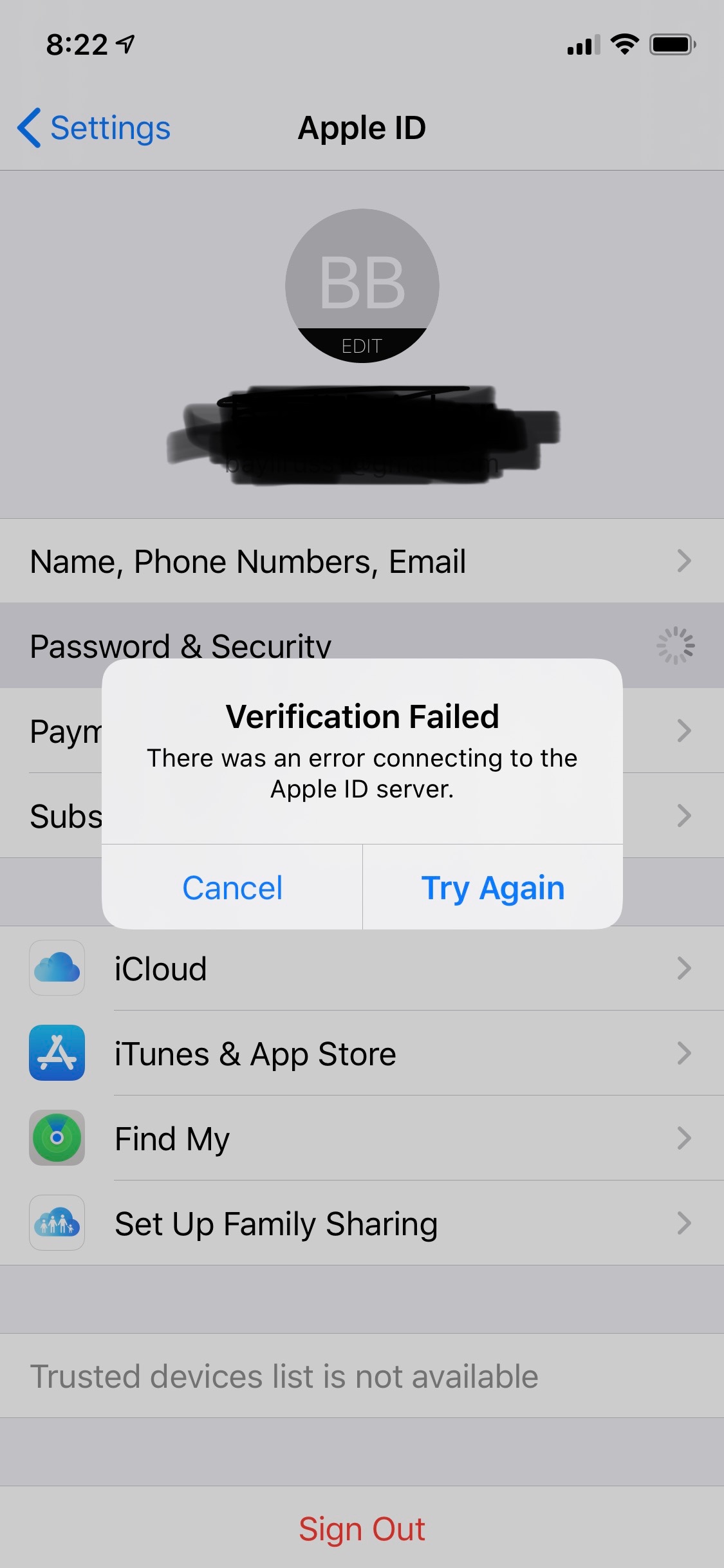 A few weeks ago I updated my Apple ID from my Mac computer because my previous Apple ID was an old college email address. Ever since then I have not been able to access anything Apple ID related from my phone, and about every hour each day I get 2 settings notifications in a row that pop up and say “Update Apple ID Settings: Some account services will not be available until you sign in again.” So I then go to my settings and click my name at the top (and I ensure that I am connected to WiFi) and a message automatically pops up that says “Sign In to iCloud: Enter the password for your Apple ID” and then shows my newly updated Apple ID that I had changed using my Mac computer. So then I enter my password - (yes I am positive I’m entering it correctly and using the correct password because oddly enough that same password and Apple ID work perfectly fine and allow me to login from my computer) - and then the little loading symbol spins and then it pops up a message that says “Verification Failed: There was an error connecting to the Apple ID server”. And then it just won’t let me do anything else or give me any other options to click or go into to try. So how do I fix this problem? I’ve also attached images of the messages I’m getting from my phone that I previously mentioned above. HELP!!