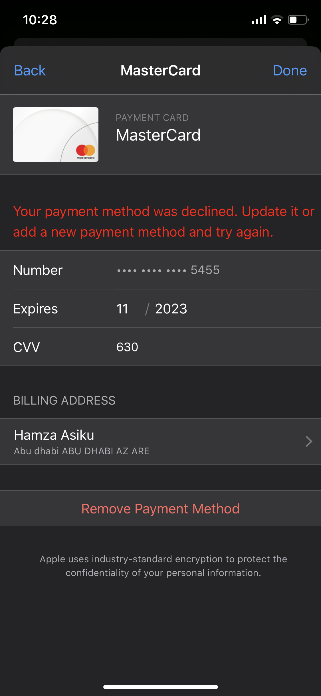 When i try to pay my apple music it tells me payment decline but i have money on my card and everything is working well on my card coz its the same card thet i have been using before