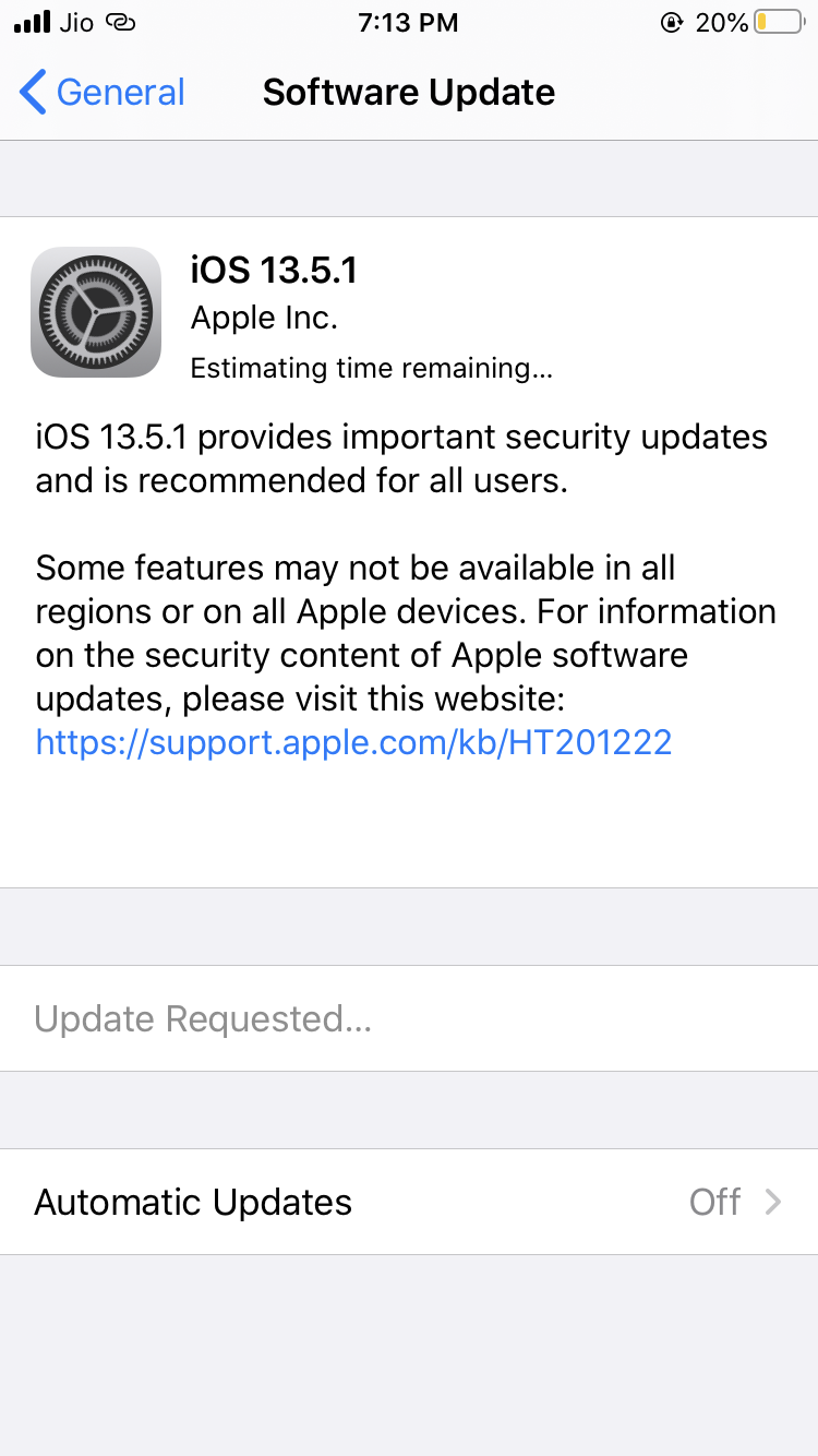 Cant update my iOS to 13.5.1 from 13.4.1 on my iPhone 7 as it is stuck at “ update requested”.