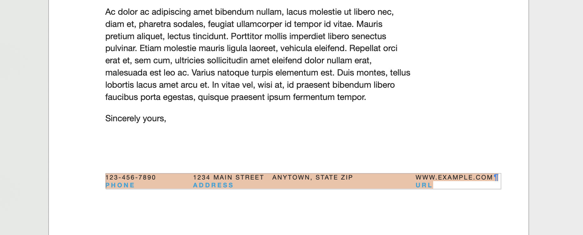 I am working with a letter template in Pages. At the bottom of the page is a placeholder for my phone, addresss, and URL. When I click/dbl-click on this, the whole thing turns orange. It doesn not allow me to select one element to edit, and I cannot figure out how to “unlock” the placeholder to allow me to keep the formatting while inserting my personal information. If I attempt to type, all the formatting for the placeholder is erased. I have searched through Help and have found no solution.