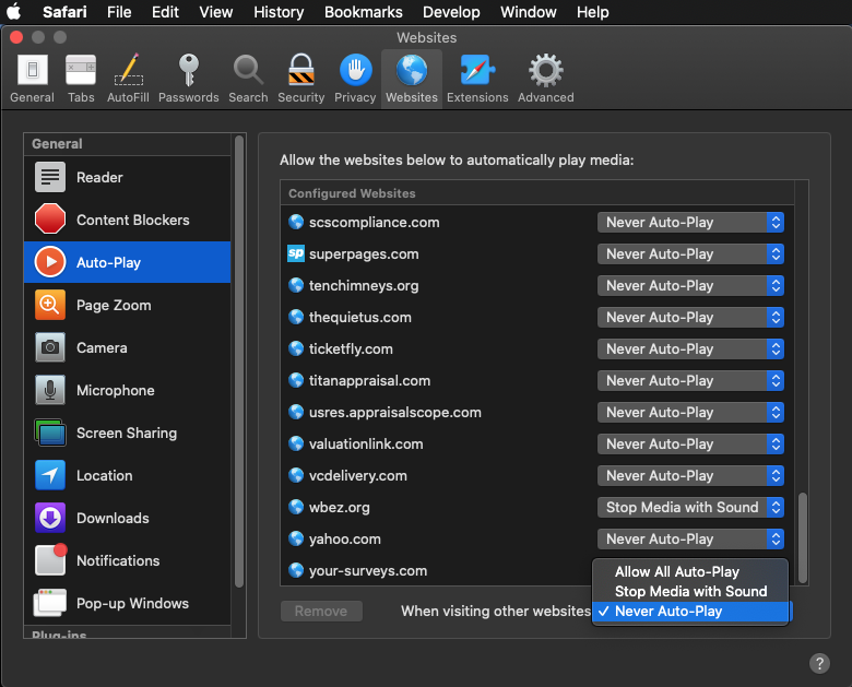 Alternatively, you can go into Safari Preference > Websites tab > Auto-Play --near the bottom right you can set a global rule to Never Auto Play.