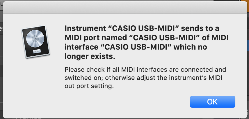 Has anyone come across this issue before and has anyone solved it? I no longer own the CASIO midi device in question, yet every time I open Logic I get the message shown below. I tried looking through the MIDI preferences in Logic and haven't found anything. Please let me know if you can help!!