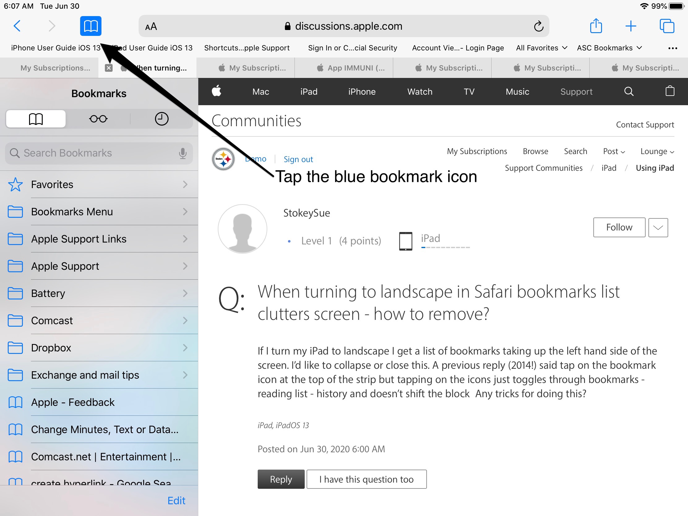 If I turn my iPad to landscape I get a list of bookmarks taking up the left hand side of the screen. I’d like to collapse or close this. A previous reply (2014!) said tap on the bookmark icon at the top of the strip but tapping on the icons just toggles through bookmarks - reading list - history and doesn’t shift the block Any tricks for doing this?