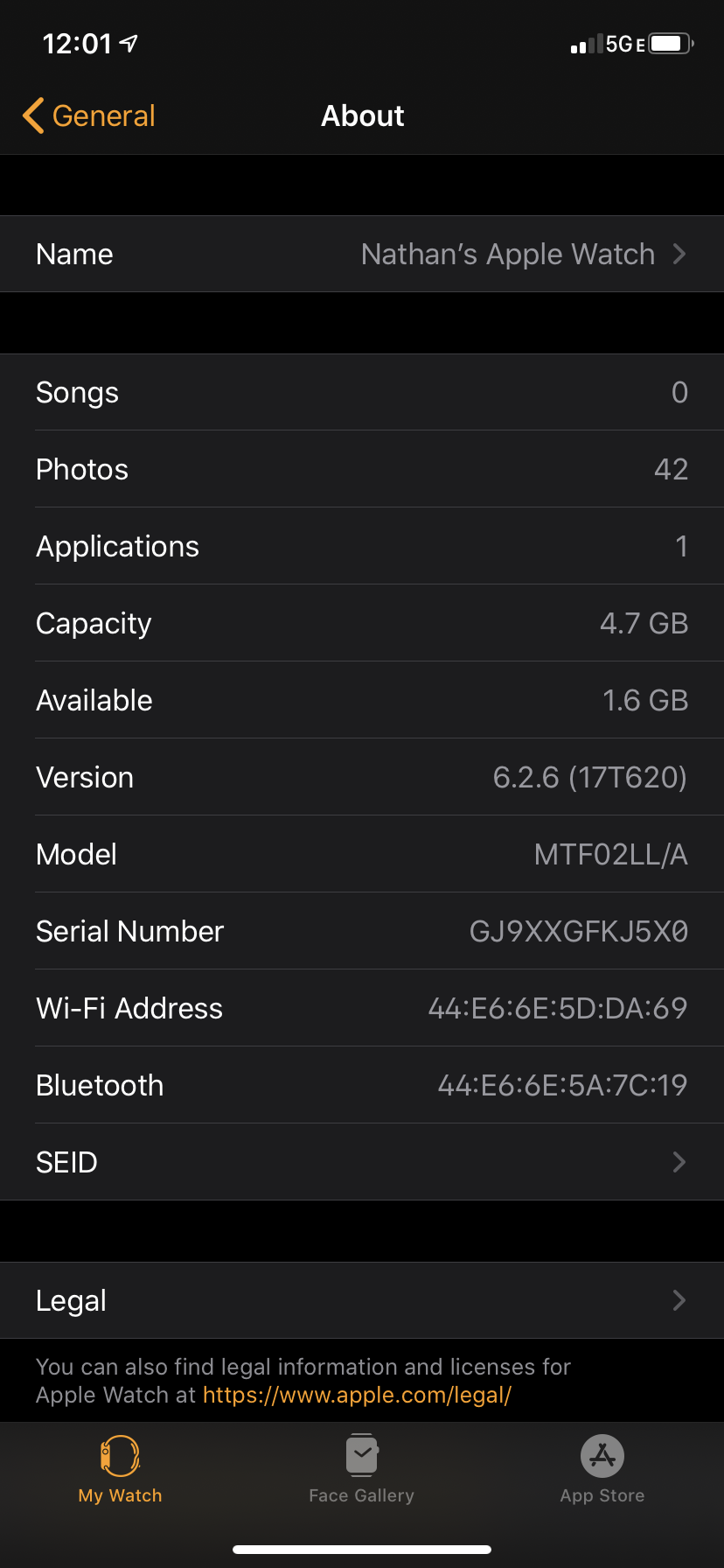 I have an Apple Watch series 3 with 1 app installed, and no music. About once a week to 10 days, the storage fills up. I have to restart the watch for it to show that there is 1.5 GB free, which is how it should be. I check the usage logs before the restart and after, and nothing changes. I can't for the life of me figure out why this keeps happening. I've searched the Interwebs as well as the support community and there doesn't seem to be an answer. I've attached photos showing the "about" section of the watch and usage before the restart and then afterwards. Any help is appreciated.