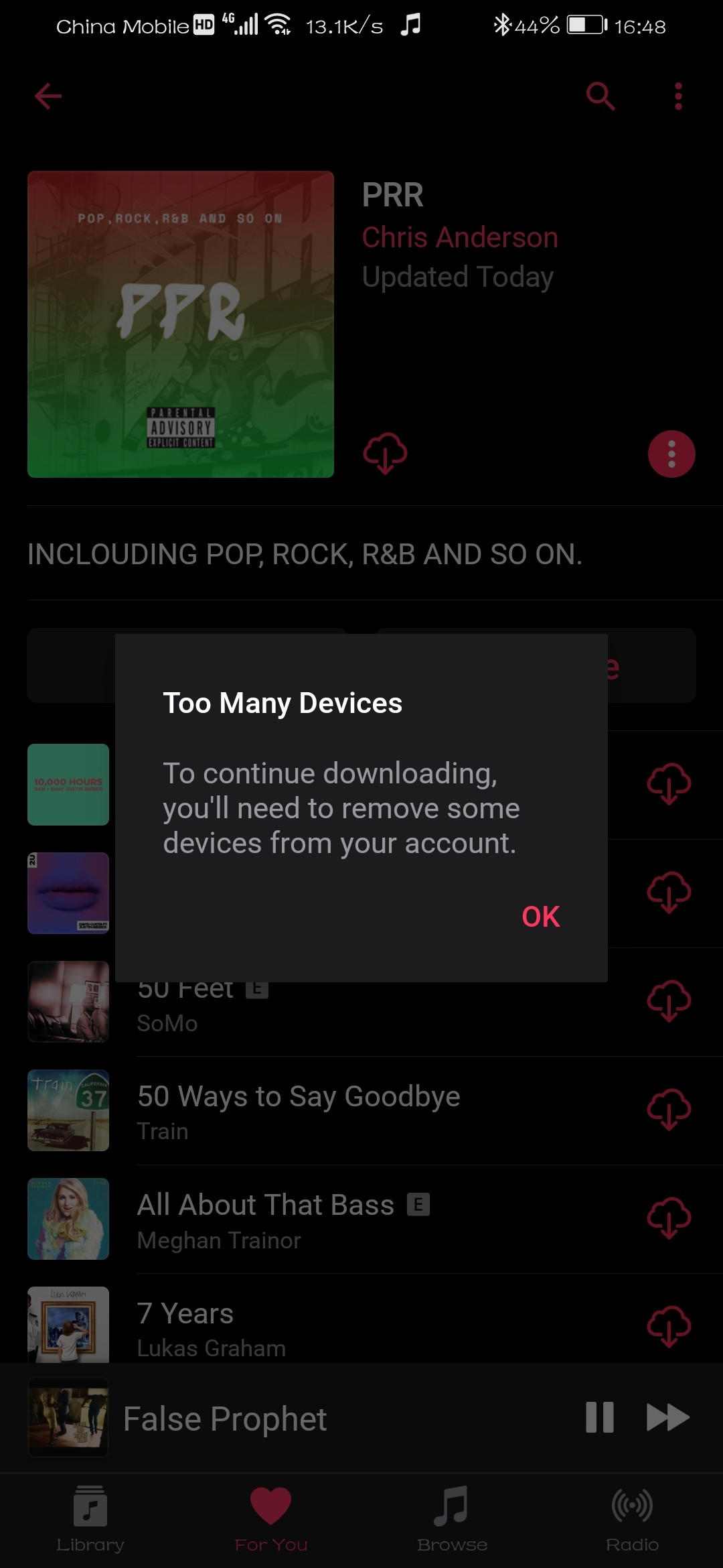 I planned to download songs from apple music in android, but the system told me that "too mang devices,to continue downloading,you need to remove some devices from your account."But I only hold two devices:my phone and a windows pc and I can download songs from itunes in my pc.I do sure my internet is ok and I've been reinstalled in many times.