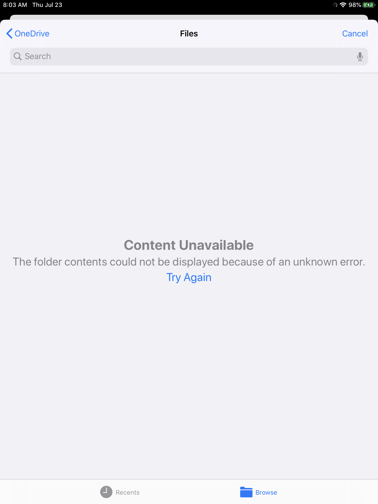 I had been using the iPad Files app successfully until recently. Now when I try to access Onedrive using the Files app I often Receive the message “Content Unavailable The folder contents could not be accessed due to an unknown error.” This is new over the last week or so. The files app still works on my iPhone. I have restarted the iPad, the iPadOS is up-to-date, I have uninstalled and reinstalled the Onedrive app. I have seen comments from others with the same issue but have not seen any resolution. Anyone have any ideas?