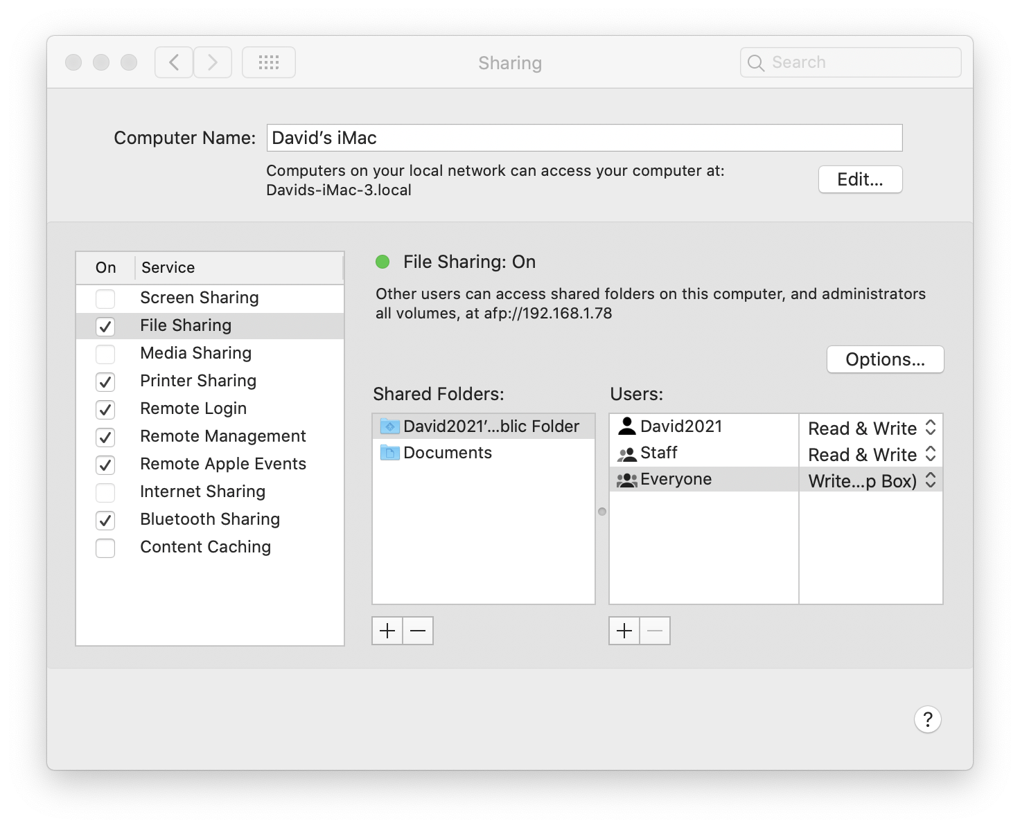 I have a new iMac running Catalina that I can connect to for screen sharing, but it won't share any files in the normal way. The only folder it will show me when I connect to it from any other Mac is an external USB disk, that is shown as 'Sharepoint'. But I see nothing in that. It won't even show me my own Shared Folder. It is clearly properly networked and connected, as screen sharing works perfectly. But that is the only option I am offered when I connect to it, despite having enabled File Sharing. I've checked all the Sharing settings on the new machine. It is very puzzling.