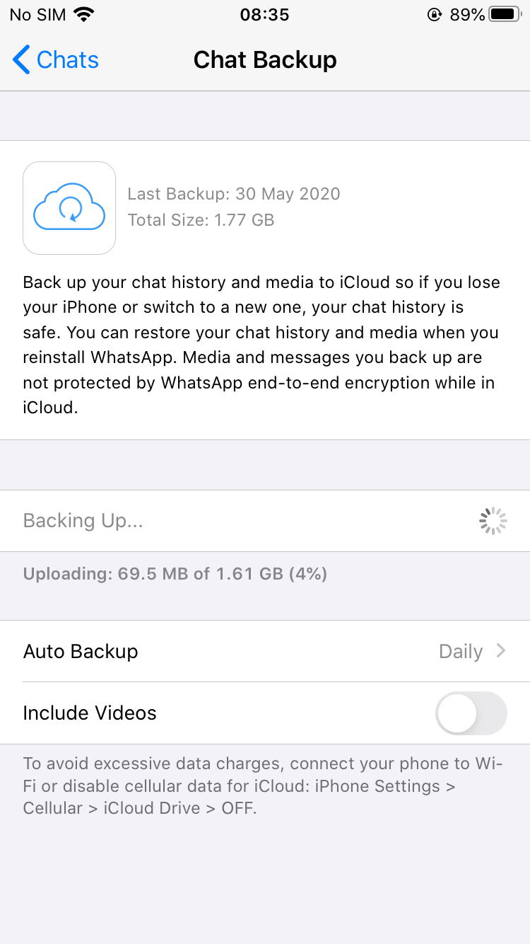 I’m not able to backup my WhatsApp chat. It is showing uploading from last two days. It got struck @ 60 mb.