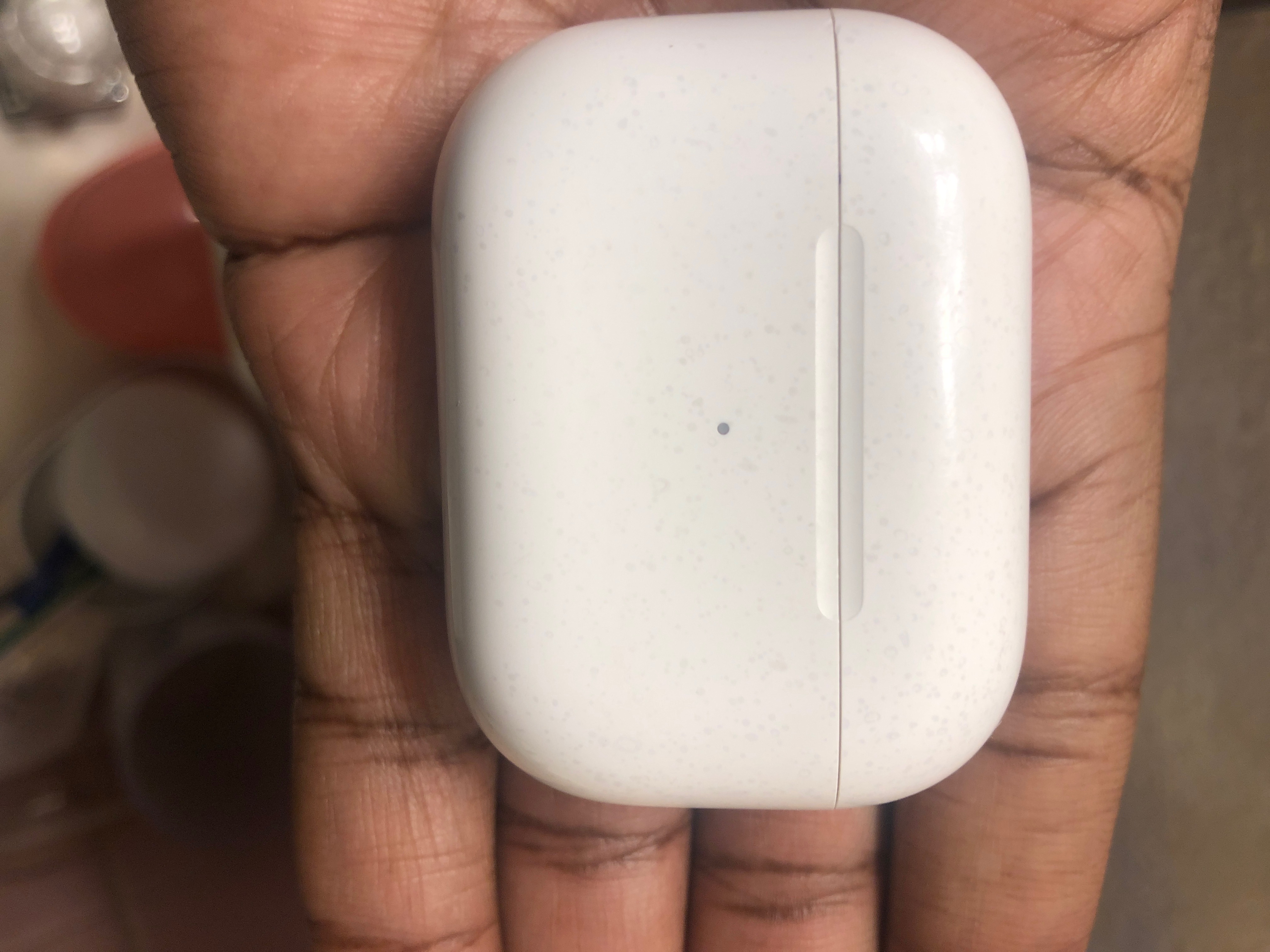 Has anyone else experience these grey spots on their AirPod Pro charging case. I’ve only had them 30 days and keep them pretty clean. I notice these spots one day after charging the case and I’ve tried everything to get them off.