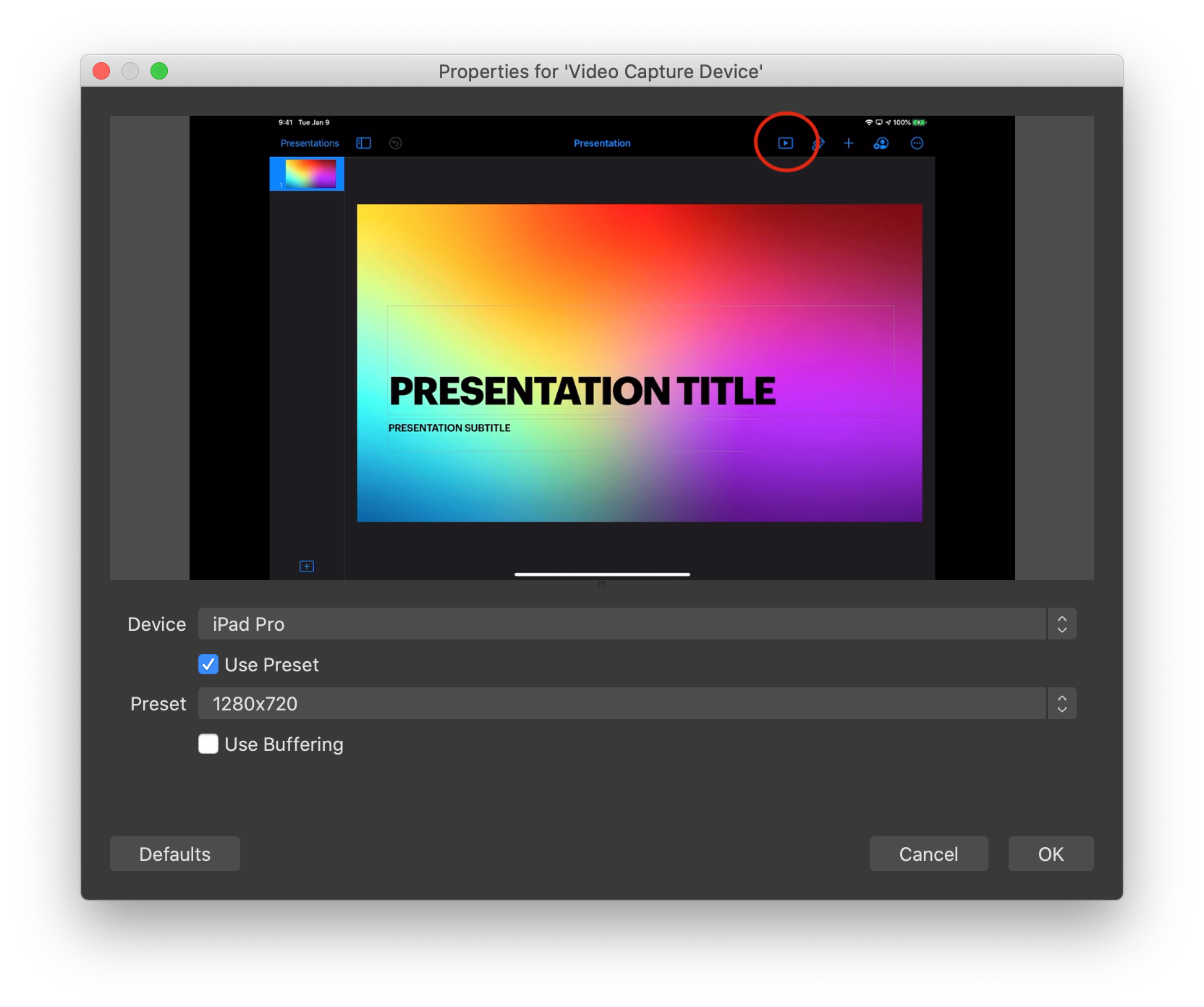 -- I have attached two screenshots of OBS with the exact same settings. In the captured iPad screens, you can see two different play buttons (highlighted) the normal triangle indicates that Keynote does not detect a second screen, and hence, only a mirror of the screen is captured, the boxed triangle indicates that keynote detected a second screen and will use the iPads screen for the presenter mode) --
