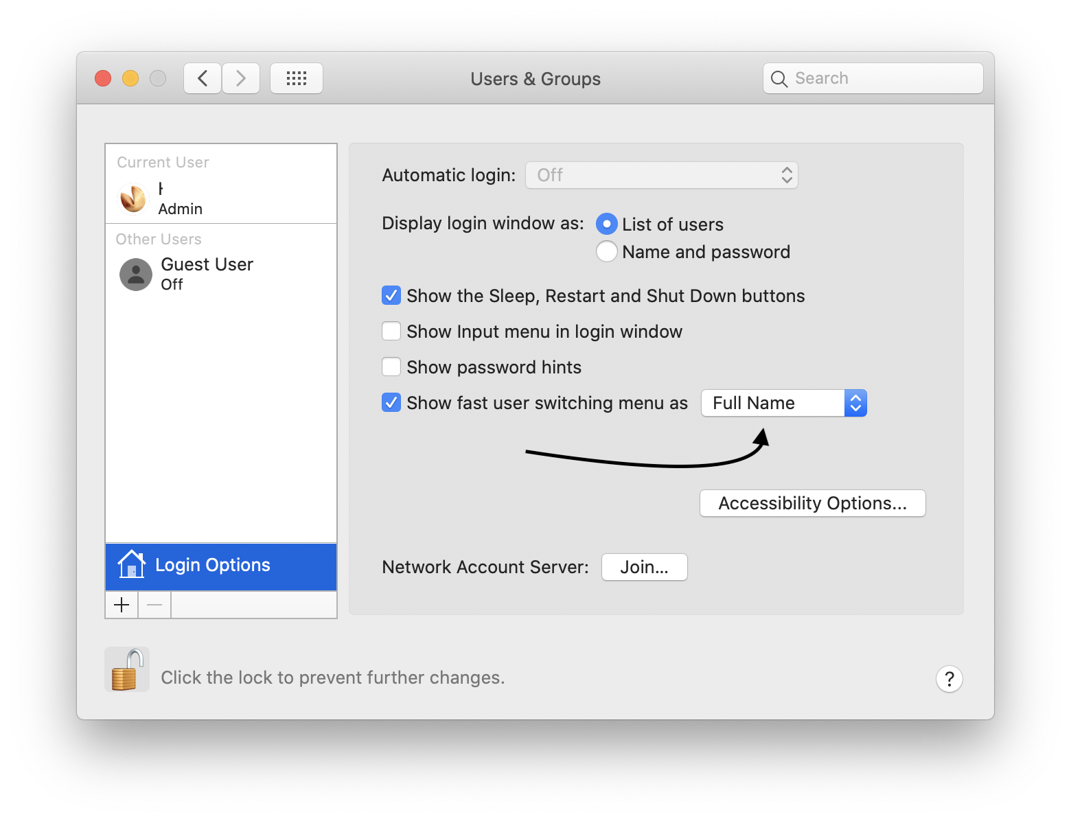If not, under 'Show fast user switching menu as' select 'Full Name'.