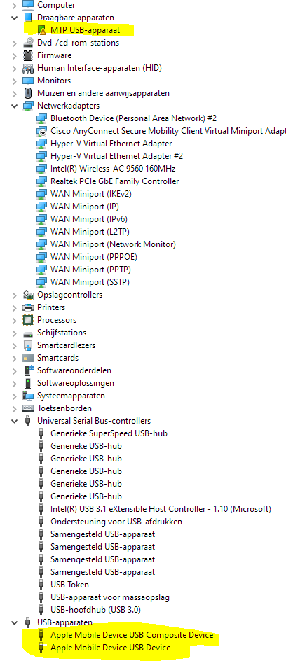 But under "Portable devices", I see MTP USP-device with a yellow mark (driver is not loaded), in stead of Apple iPhone.