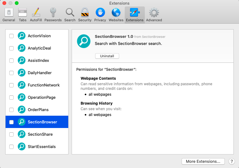 Next: open Safari and select the Safari menu > Preferences... > Extensions. If you see any Safari Extensions that you do not recognize or understand, simply click the Uninstall button and they will be gone. No Safari Extensions are required for normal operation. Then, select the General pane and review your Homepage selection. Repeat those equivalent actions for any other browser you may use (Brave, Firefox, or Opera for example).