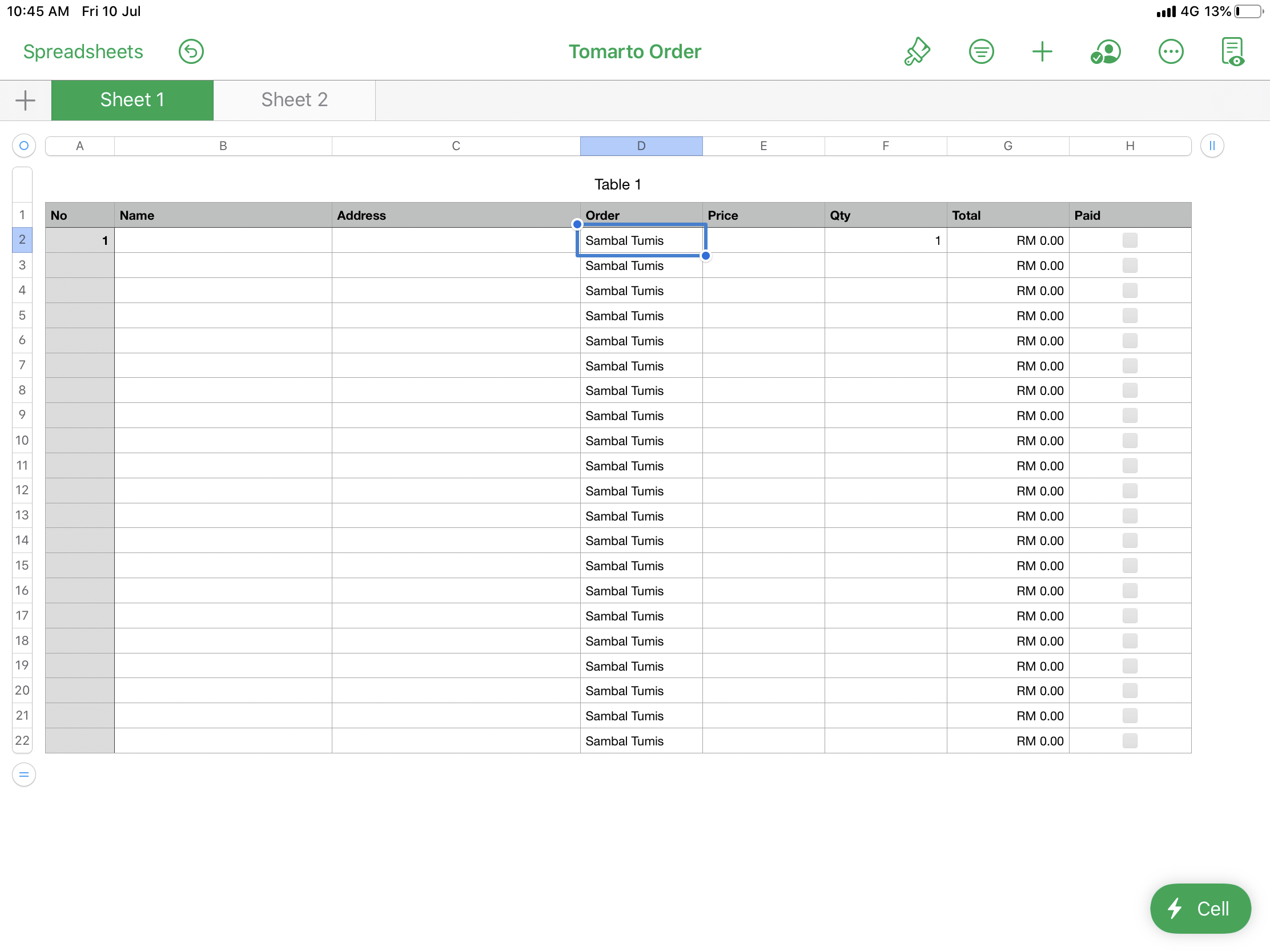 For example, when I select “Sambal Tumis” the price will automatically show on the price cell.