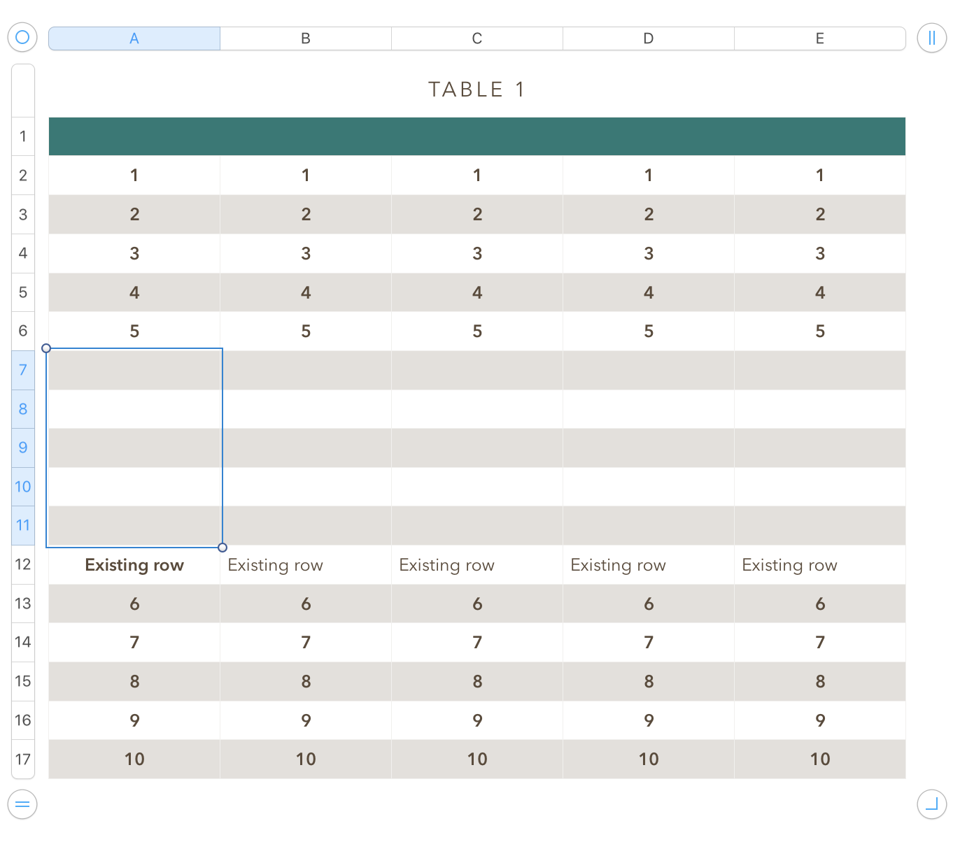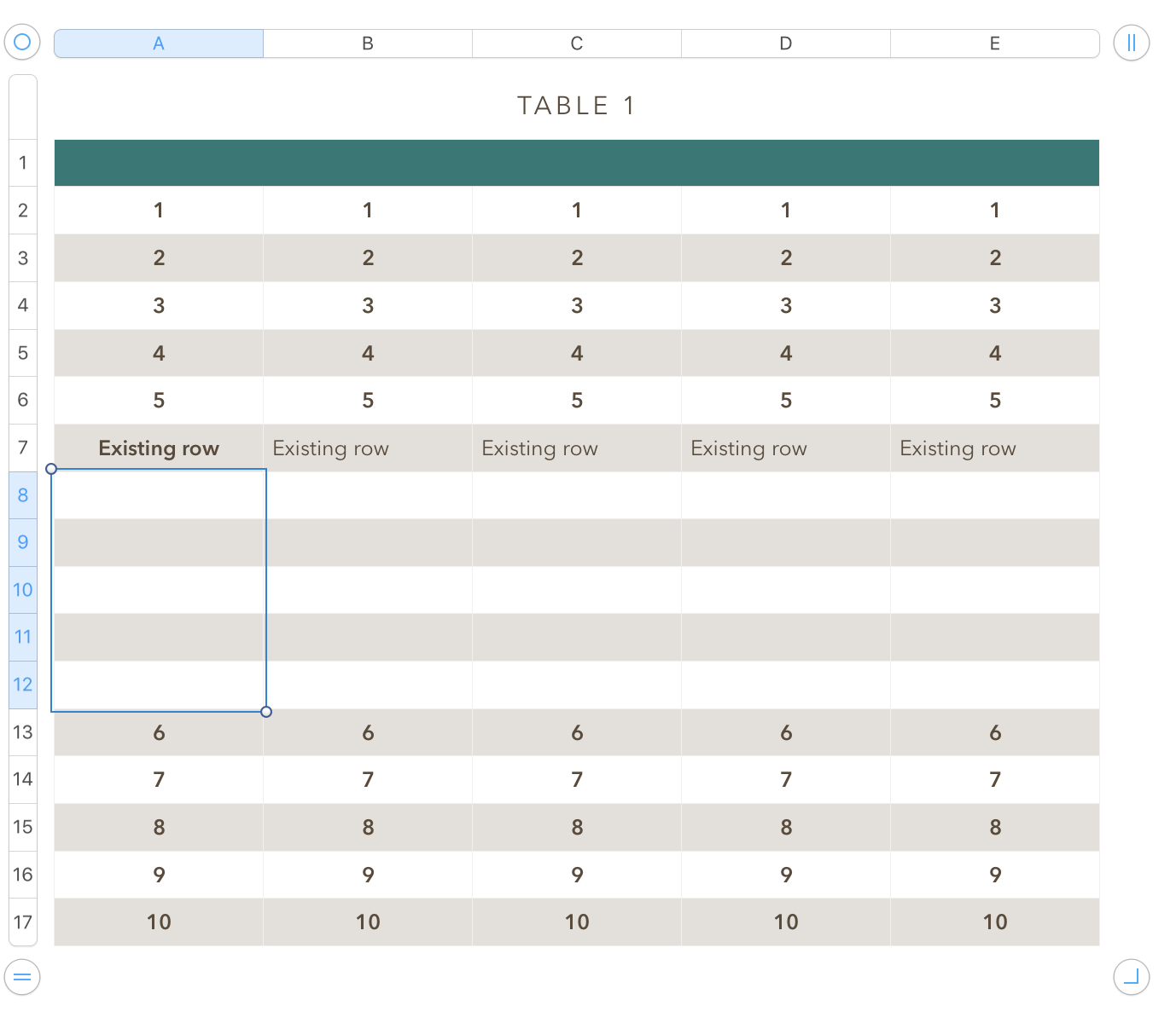 To place 5 new rows below Row 7—starting from the initial table (first image), Select the five cells shown below (or any block of five cells in a single column, in the same five rows as shown):