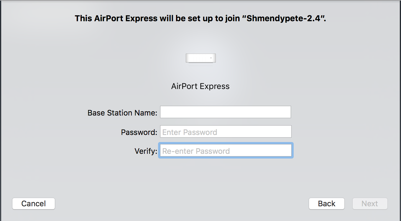 I have used my airport express (model A1392) in the past for Airplay with no issues with an Airport as my main router. I'm not trying to set it up for the same thing with a Netgear router. I've reset the airport express and am in the Airport Utility setup process. I click 'Add to Existing Network', find my network and then get to this section and I'm not sure what to put in: