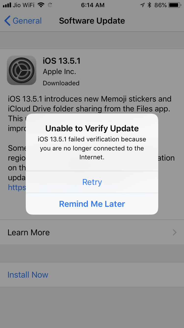 My IPhone 7 IOS 13.5.1 upgrade failing with the measage ‘ unable to verify update’. I am in same wireless internet connection but still getting the message “ you are no longer connected to the internet “. Please help me. Thanks