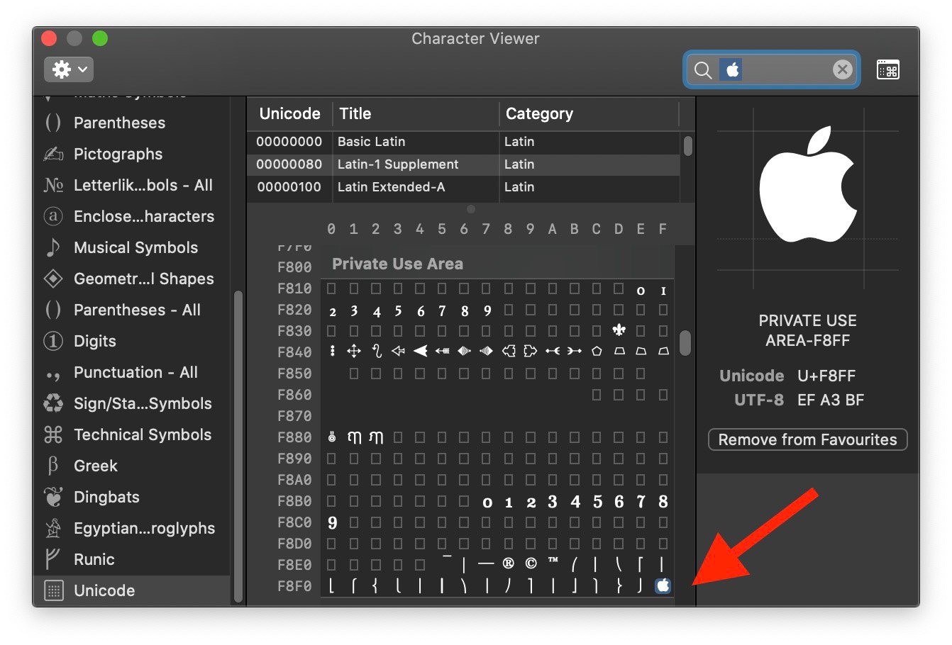 To write the , you can use the Character Viewer. You can launch fro "Edit > Emoji & Symbols". when the palette opens click the tiny palette to the right of the search field. You have to customise it to include all unicode characters. The  is in the Private Use Area, under F8FF. Once I found it, I added it to the favorites.
