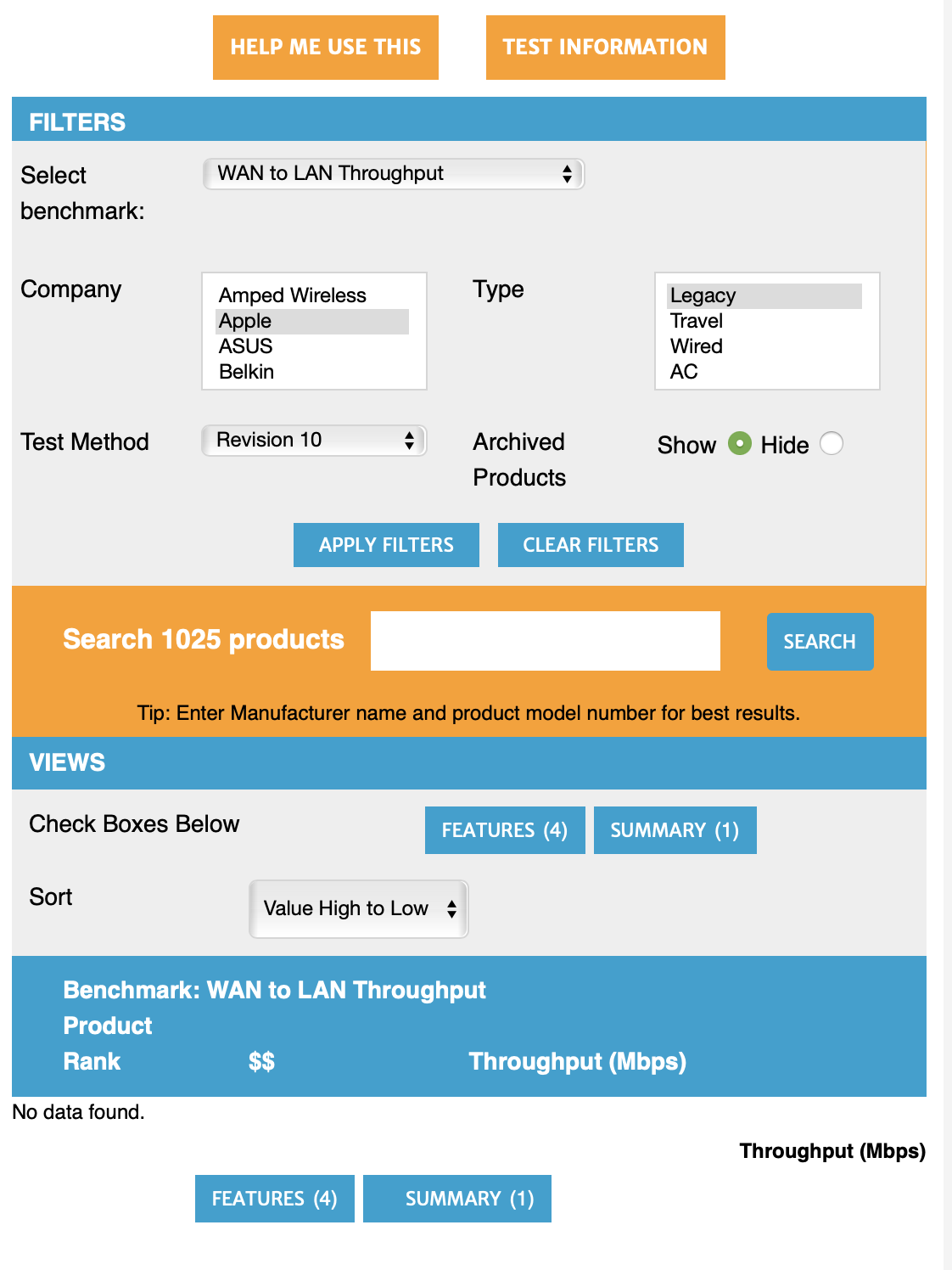 As I mentioned before, WAN to LAN speeds are not displayed in the specification sheets for most products, so unless you can get a hold of that number, you won't know what kind of Internet connection speed that the router is capable of handling. If you can't find a given product in the router test chart, it is either out of date or it has not yet been tested.