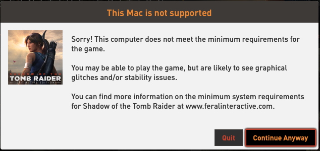 I have game shadow of the tomb raider, but I am not able to play on mac os, because of these message: