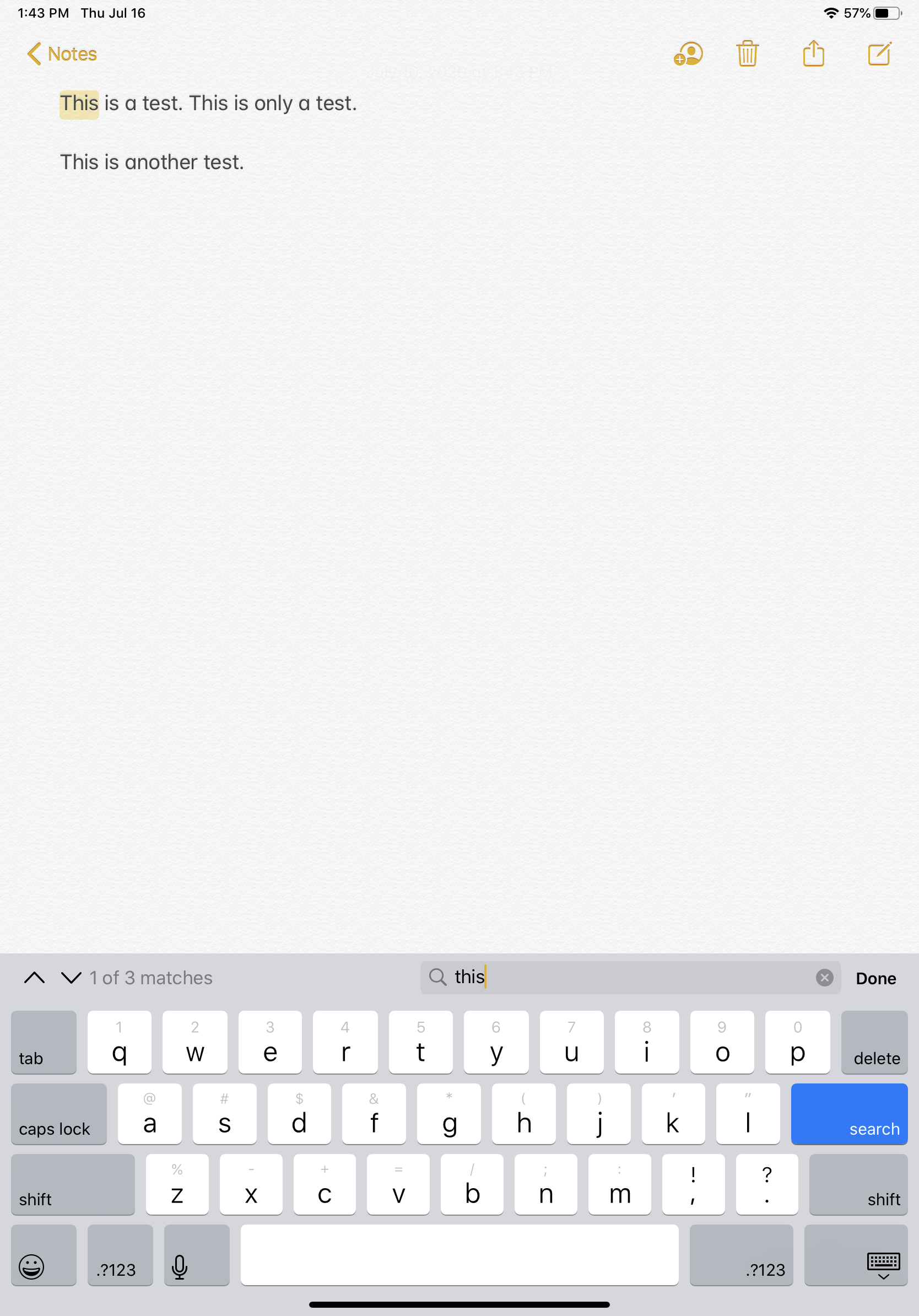 Here’s the result. (Note I searched for “this” on the bottom.) I may use the up-and down-arrows to move among the three found occurrences.