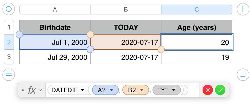 Can anyone please help. What I am trying to does this. I am working on a family birthday reminder spreadsheet. I know everyone's date of birth. I will have the names in column 1 and in the next column 2 would be their date of birthday. What I want to be able to do is to be able to open the spreadsheet and be able to view in the next column 3, their current age in years so I know what birthday card to buy.