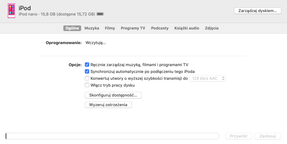 I have an iPod nano and a MacBook with Catalina. After connecting the ipod and entering the Finder, I can't sync anything. After selecting, for example, "Sync Audiobooks", the "apply" button is inactive. Besides, in "general" the software info keeps loading and doesn't show up.