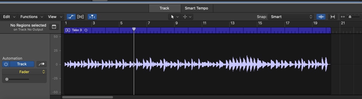 I recorded a track on guitar. Then wanted to retrack a certain part at a latter time. So I did that and when I listened to the track all the way through the retracked part was way quieter.