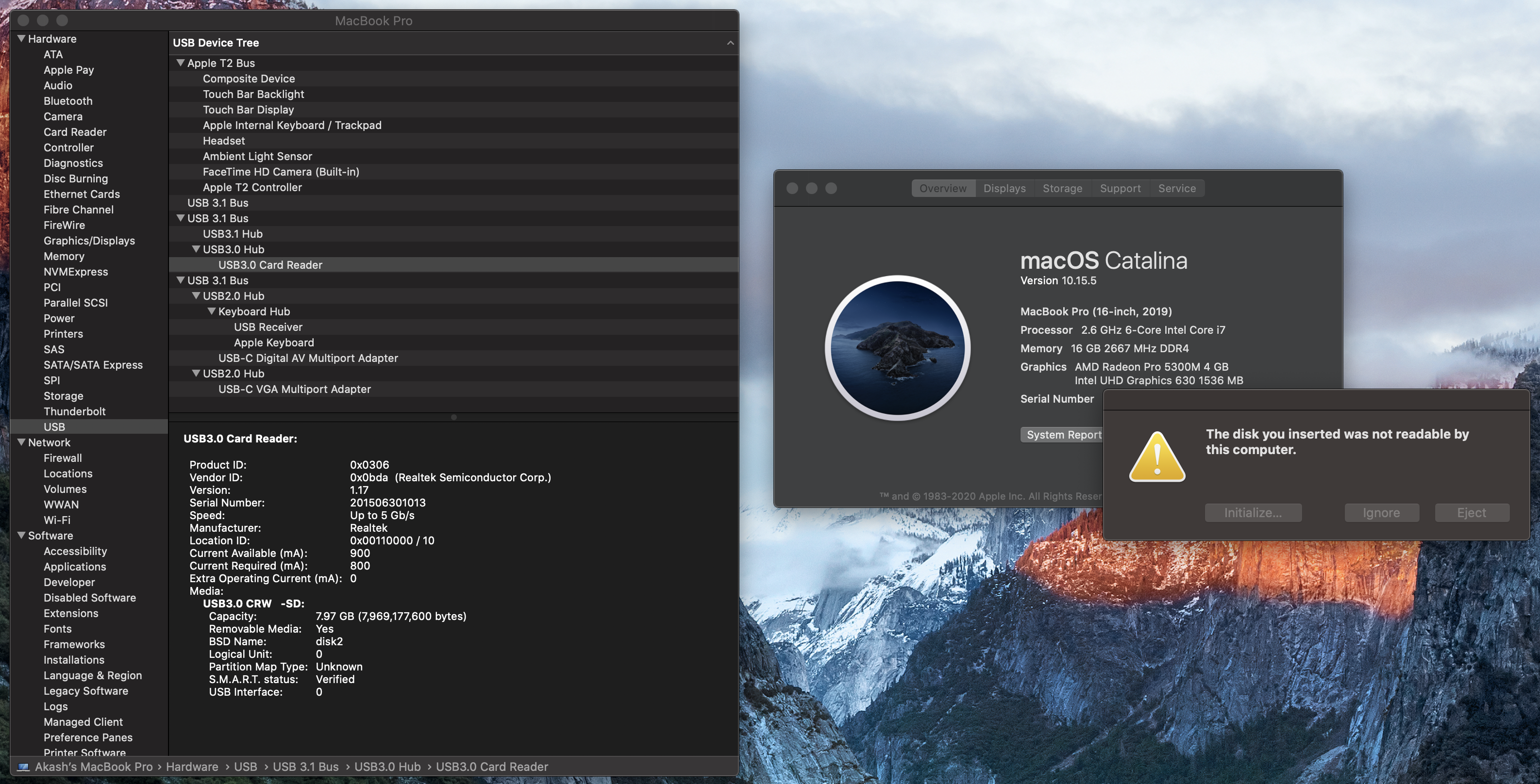 When I check the system report as well, the USB 3.0 card reader shows me the SD card, but I can not read it.
