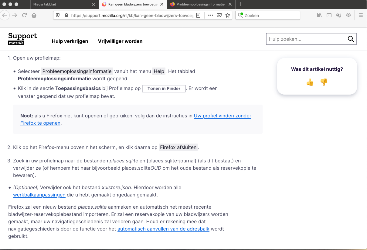 The help page of Firefox advised to restart the Mac, which I did. No problems with restarting, but the problem was not not solved. so I tried the following advise of the help page of Firefox: