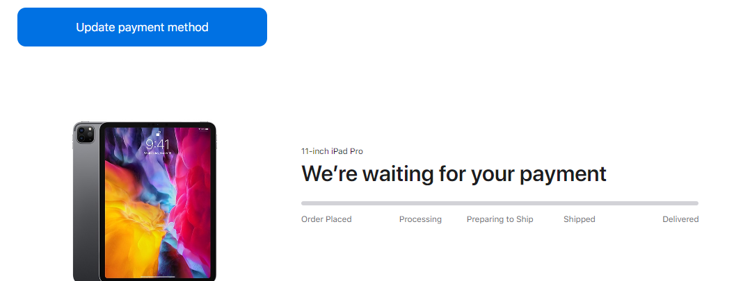 Right now the iPad pro 11 inches has been delayed because the store "can't access my card for payment". So I updated the payment method. And clicked PAY NOW to update the billing. After the page loaded nothing happened after. But I got a confirmation email that my payment method was changed. What I'm curious about is that when I go to the apple store, my order still says "Your order is on hold" even though I already updated my info. And my order hasn't had the "order placed" on the the green bar that appears when you order from the apple store.