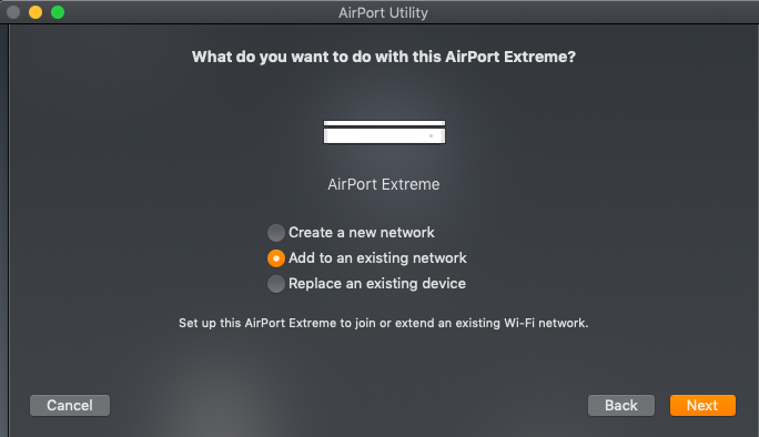 I then tried to "Extend" the existing network in Airport Utility. Again, doing this in the house much closer to the Netgear router and connecting the two via cable. Airport Utility then flashes the amber light and also displays a Red dot with a number 1 in it. I'm not sure what the Red number 1 indicates... I've never seen this before.