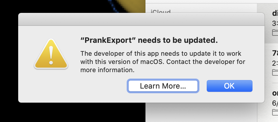 display dialog "The developer of this app needs to update it to work with this version of macOS. Contact the developer for more information." with title "“PrankExport” needs to be updated." buttons {"Learn More...", "OK"}
