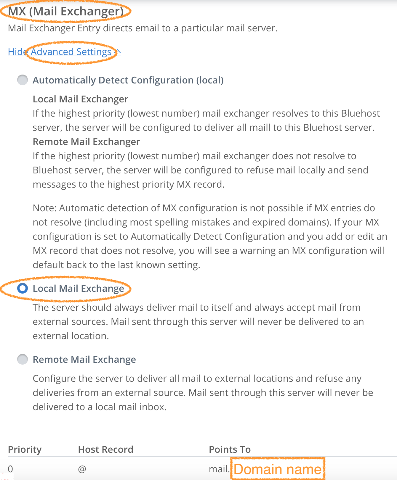 • Be sure that under your MX (Mail Exchange) Advanced Settings it is set to Local Mail Exchange and, as above, points to mail.yourdomainname.