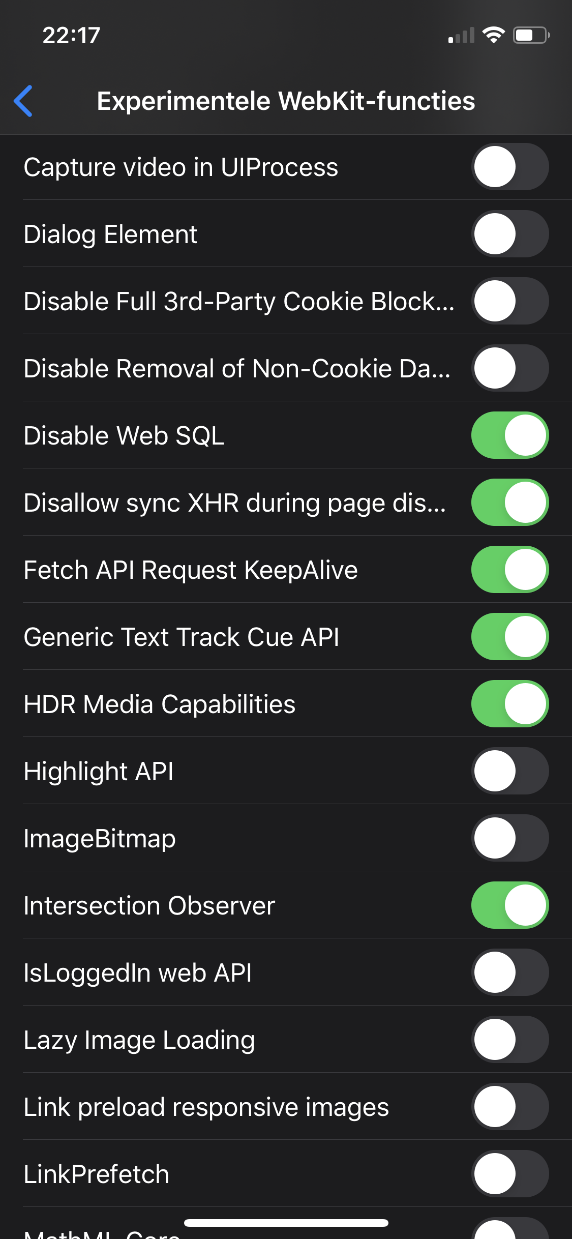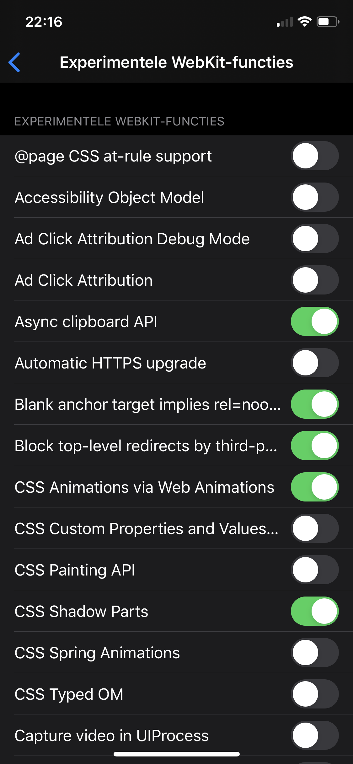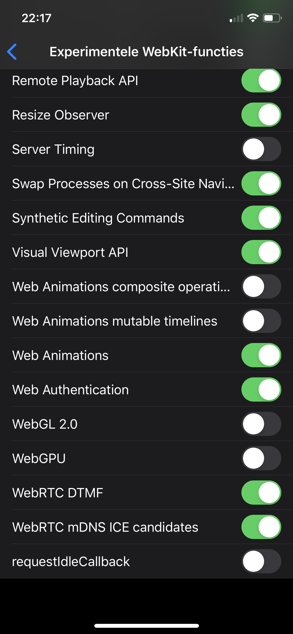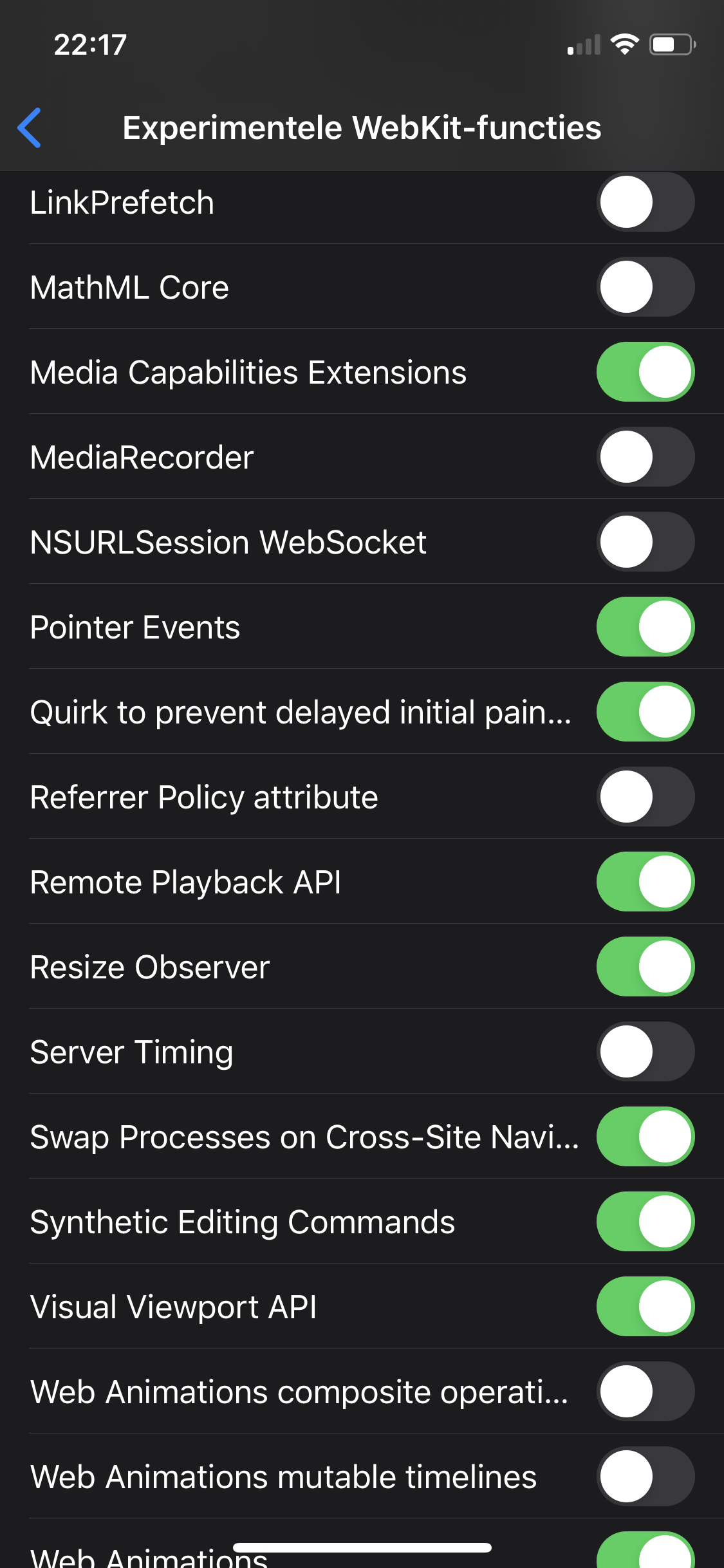 I was turning on and off experimental features in safari, and now I don’t remember the default. Could you please go to settings, safari, advanced, experimental features and tell me what you’ve got? Thanks so much!