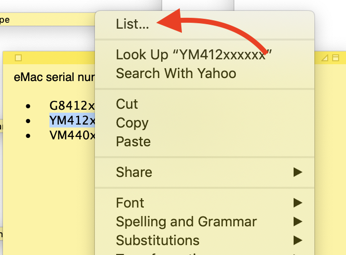 The Stickies User Guide for Mac - Apple Support says to "Format a list: Control-click in the list, then choose List. You can change the bullet type." I've tried this and am not getting the List option. Does anyone else have this issue? Anyone have a fix?
