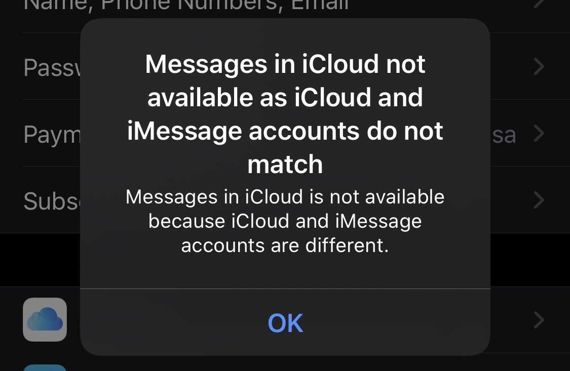 I restored my iPhone Xs for a clean install (iOS 13.6). I am now trying to download all my Messages from iCloud. I am getting the error "Messages in iCloud not available as iCloud and iMessage accounts do not match"