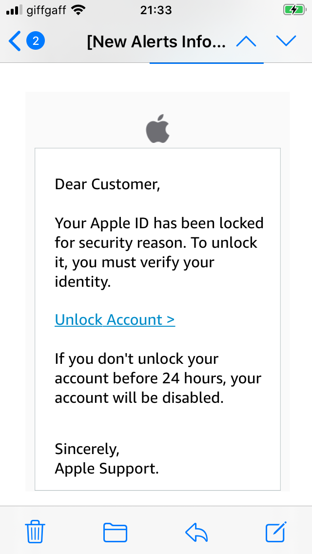 I have just received a email saying, in 24 hours my iPhone will be locked. Is this a scam mail because I don’t think apple would say this in a email. I will put it up could somebody tell me if it’s fake thanks.