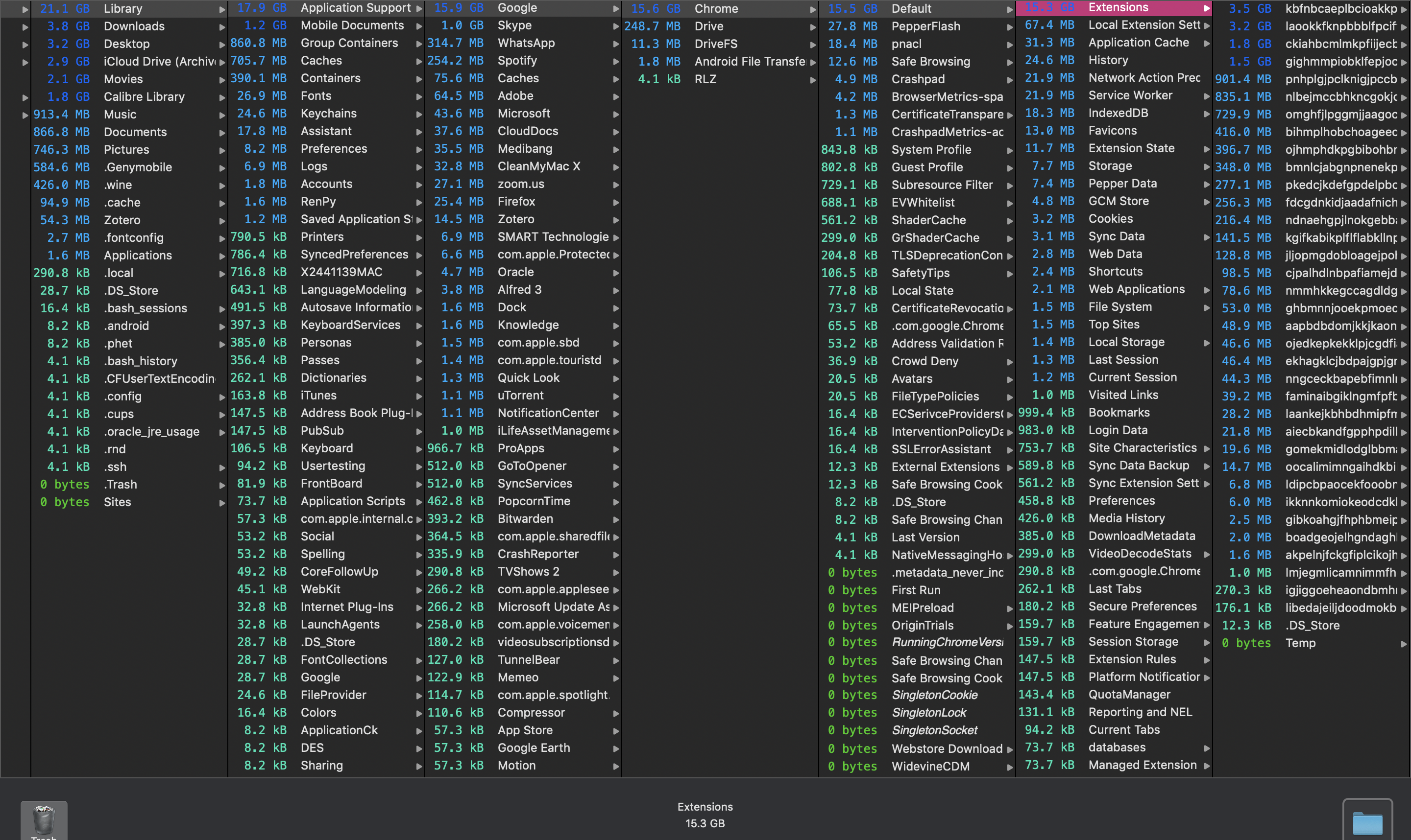 I was doing a sweep of my mac using OmniDiskSweeper, and found a folder (Application Support > Google > Chrome > Default > Extensions) that is stated to be taking up 15.3 GB. Four folders within the Extensions folder are taking up 3.5 GB, 3.2 GB, 1.8 GB, and 1.5 GB respectively.