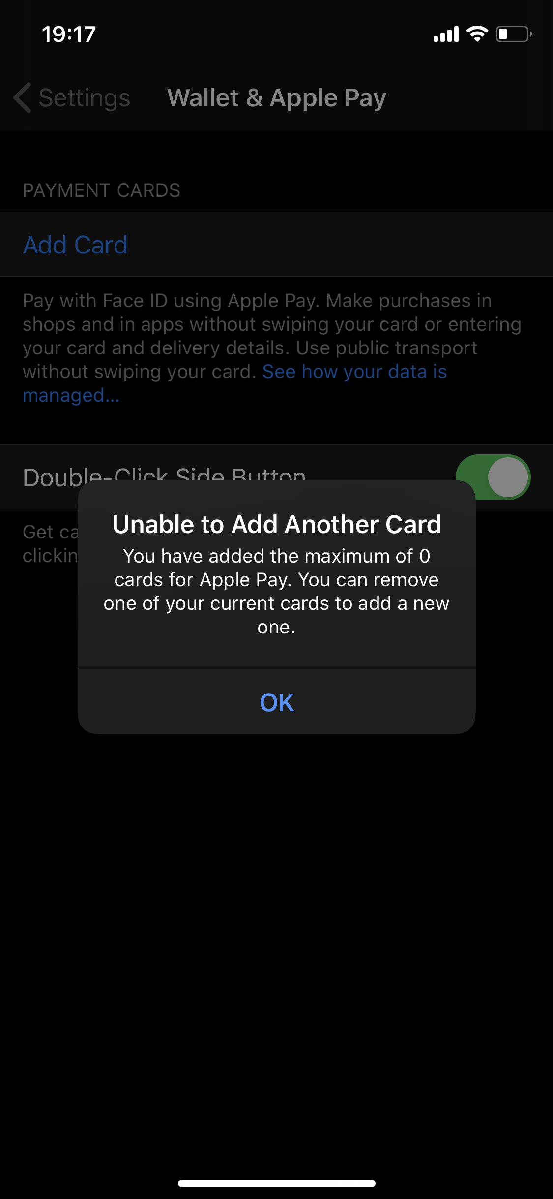 It is just a black screen When I try to open the wallet, then when I add a bank card via settings, it shows me that
