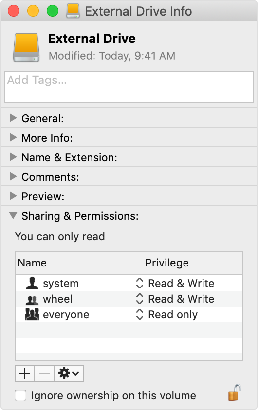 I have been using this disk for about 4 years. The Permissions look correct for a TM disk and are the same as the new one, which I set according to the instructions on the original Apple Support article.