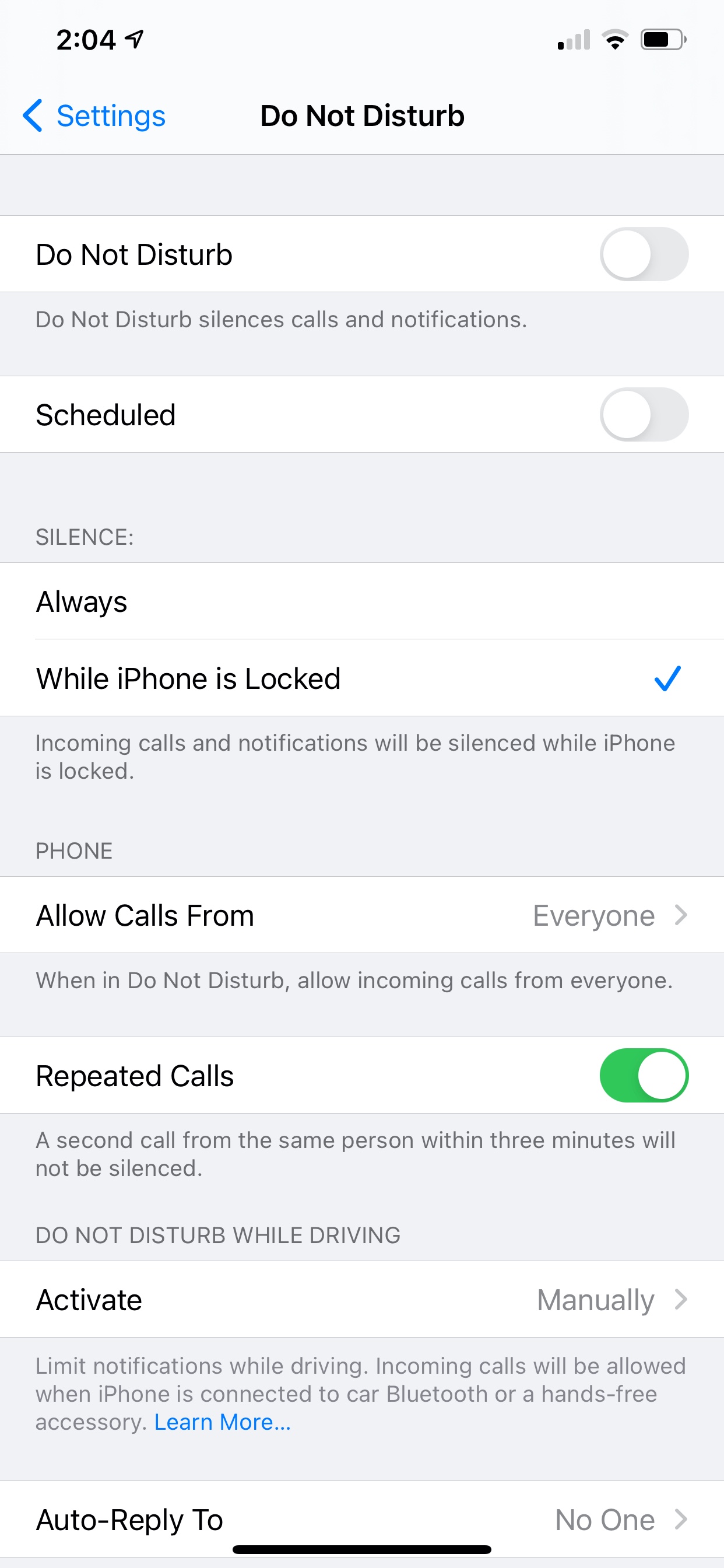 After the last iOS update, my iPhone 11 Pro Max (iOS 13.6) has decided to silence calls from any number outside of My Favorites list, and it will also not ring/vibrate when receiving ANY texts, regardless of who they are from. This only appears to happen when the phone is locked.
