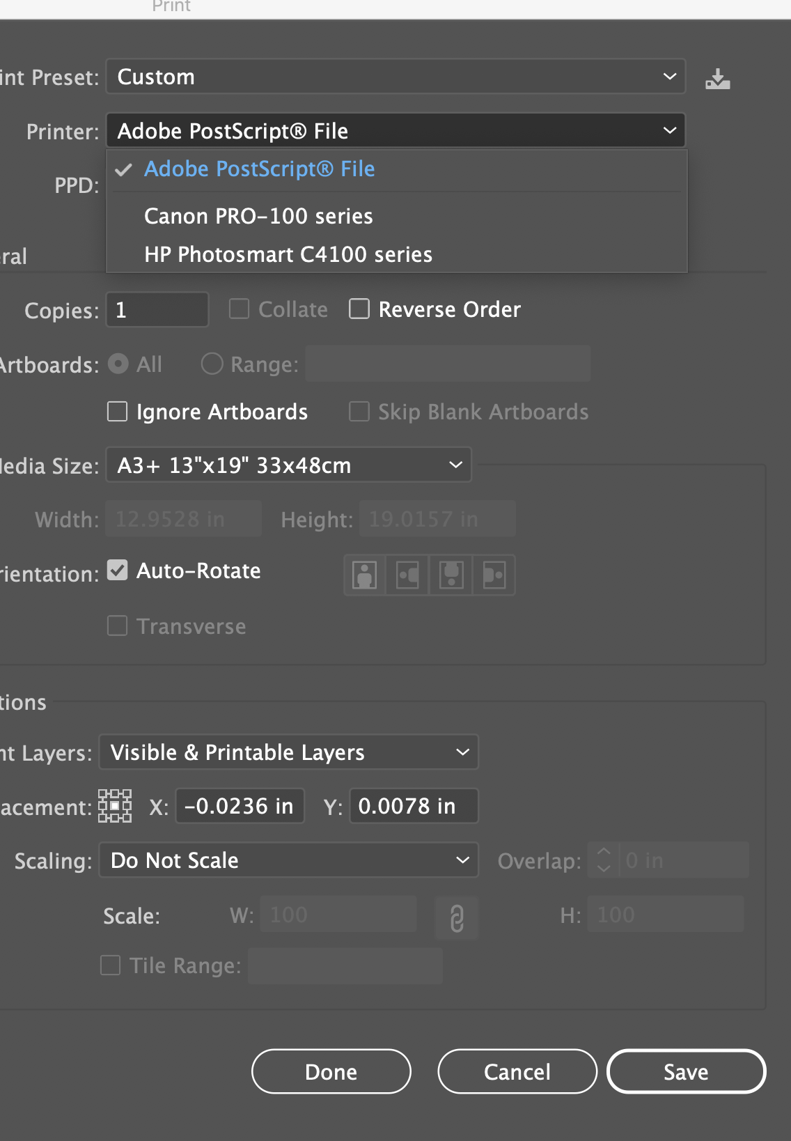 I am having trouble getting the printer driver that I recently downloaded to show up when I print from Illustrator. This printer was purchases used, but I went through and downloaded all the available software for my Mac (OS Catalina) and I still can't get it to recognize the driver. I can change the print options to Adobe Post Script File and then it will save it for me. I then need to go find the file and print from there. Although, it can be a crapshoot to the size.