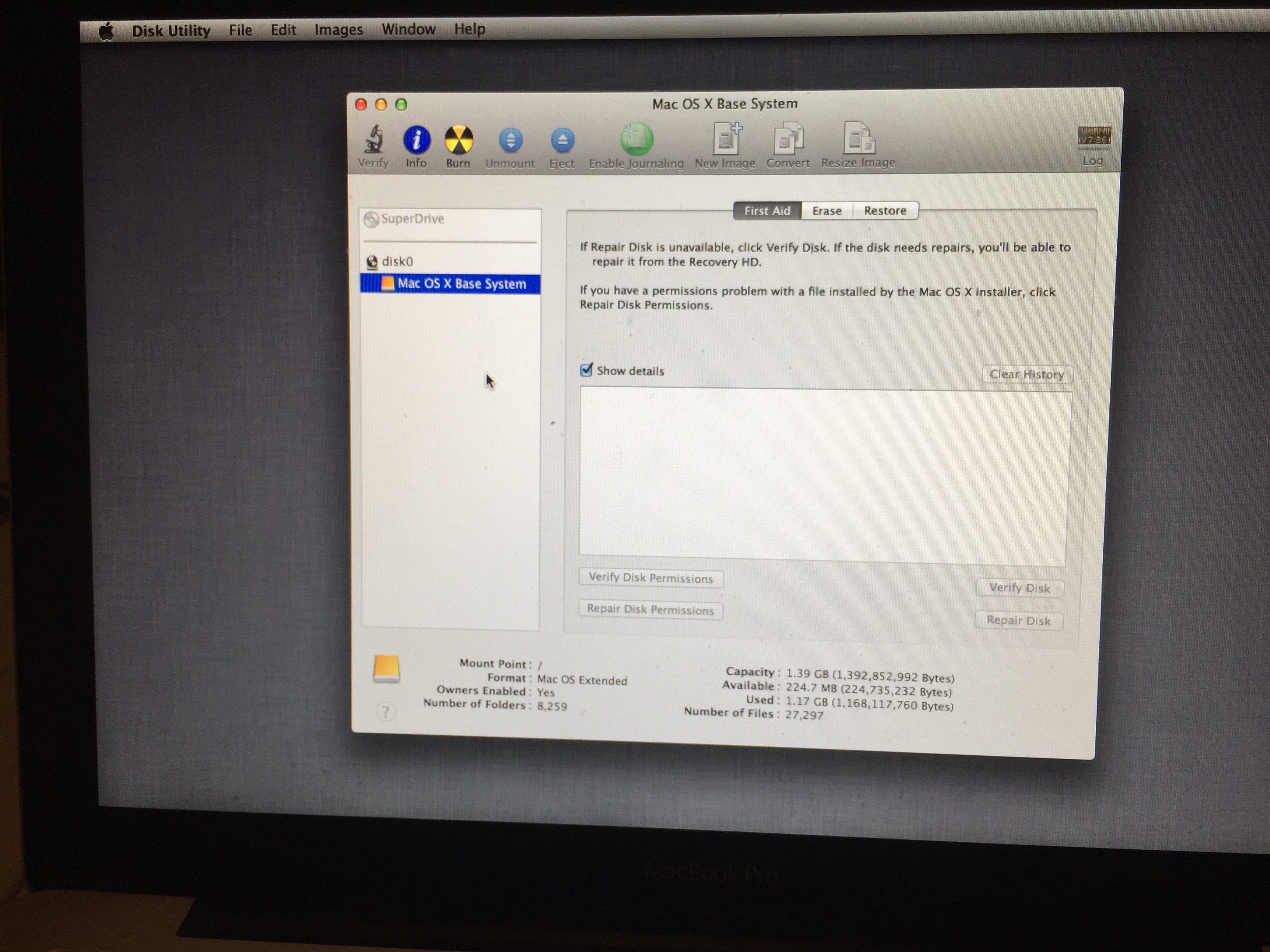 I went through the suggested steps but got stuck when I tried first aid. See picture below. I clicked on the Mac OS X Base System and the first aid box appears (beside it is erase and restore up top) and there is a white box where I think my disks are supposed to appear and then the verify disk permissions and repair disk permissions and verify disk and repair disk buttons are all greyed out. I’m assuming there needs to be files in that white box that I can ‘perform’ first aid on.