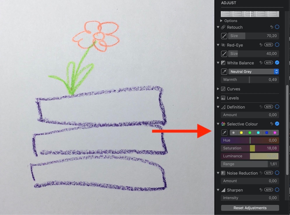 My photo of an illustration has a light grey background that should be pure white. Can I change this in "Mac Photos"? How?