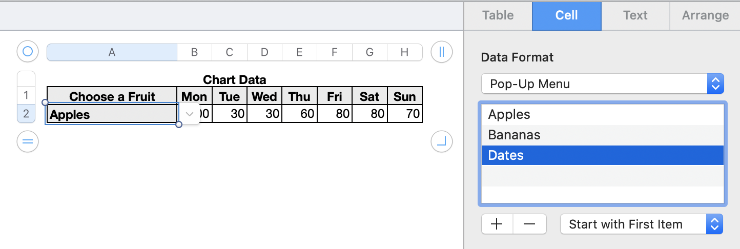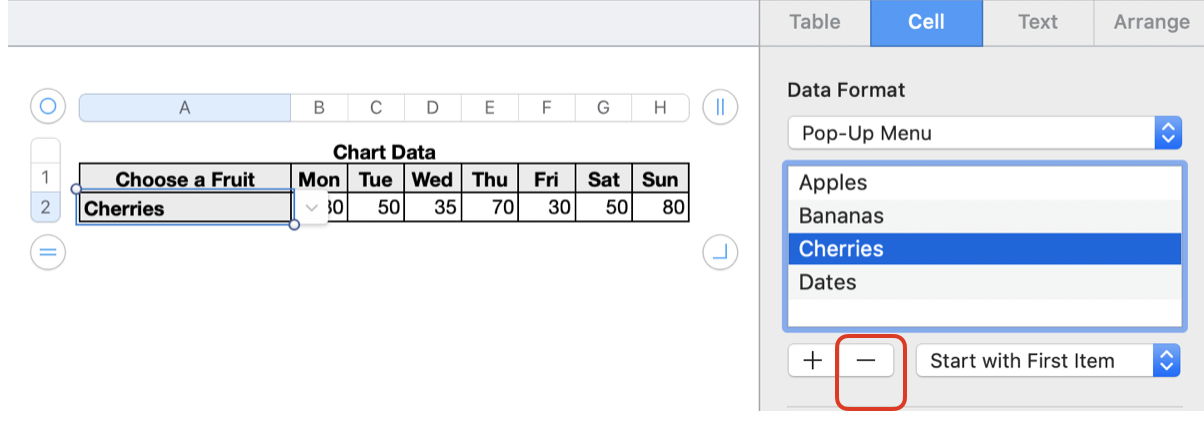 In this example, to delete the menu item 'Cherries' you can do it in Format Panel > Cell