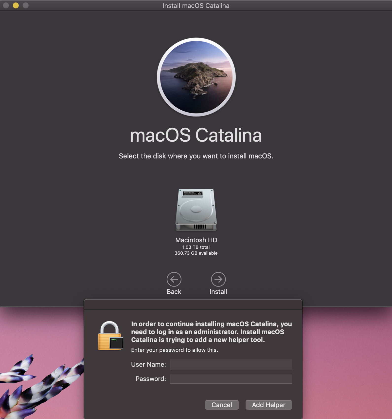 In order to continue installing macOS Catalina, you need to log in as an administrator. Install macOS Catalina is trying to add a new helper tool