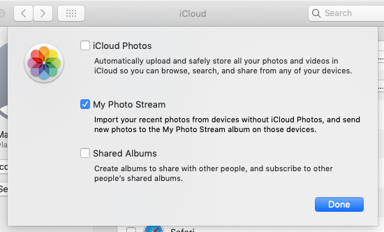 System Preferences>iCloud>Photos shows THREE options - iCloud Photos, My Photo Stream & Shared Albums (ONLY My Photo Stream selected).