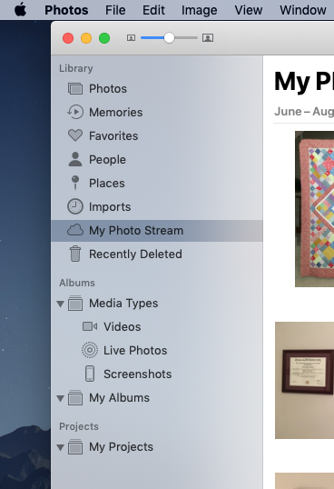 Photos app (Ver 4) shows the following under Library: Photos, Memories, Favorites, People, Imports, My Photo Stream and Recently Deleted. Under Albums: Media Types (Videos, Live Photos and Screenshots) and My Albums (blank). Under Projects (blank).