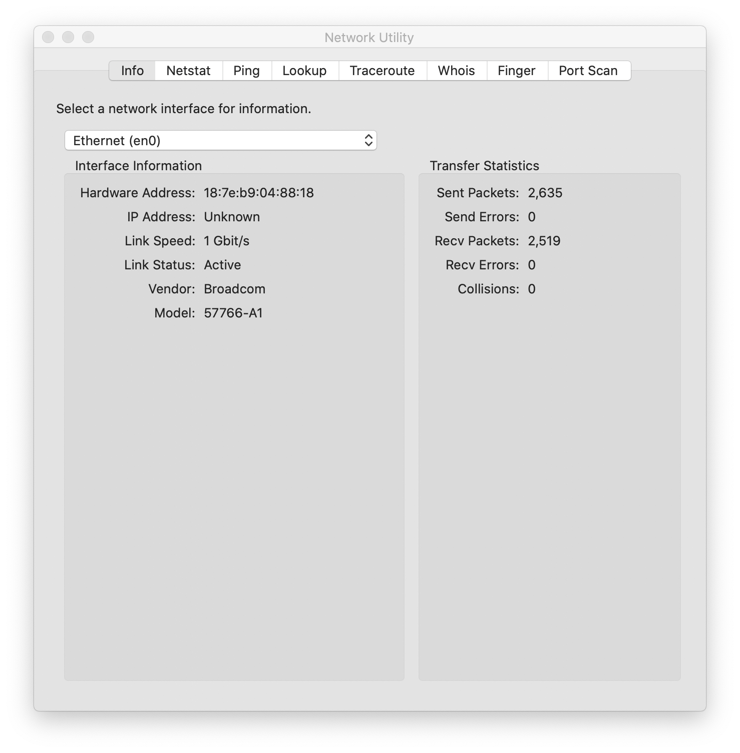 Which looks fine, but I have no connectivity to the router or anything. So, checking on thethe Network Utility, I get: